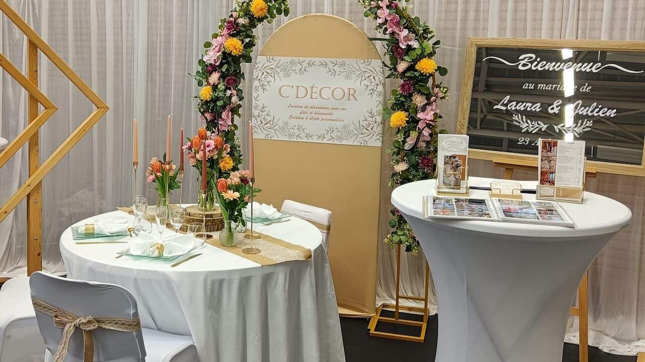 Vous pourrez trouver chez C’décor un large choix de produit : arche de cérémonie, vases et bougeoirs, centres de table,nappage et éléments décoratifs pour votre salle : (lettres LOVE géantes, rideaux lumineux…)